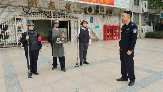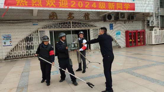 杜警官细致讲解了盾牌、钢叉等安防器械的使用技巧、防恐防爆战术与战法动作要领、校门突发暴力事件的处置与应对等。对最小应急单元组合战术、现场控制等进行了现场演示训练,并开展了现场应急处突演练,对训练中发现的不足,现场指出、给予纠正,力求做到标准规范、高效实用。