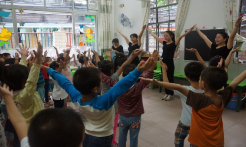 我院学生选取了创意操中的的集中训练与礼仪训练部分作为示范表演,随后大家分为七个小组,分别进入七个班级进行创意操“集中训练”与“礼仪训练”的教学。为了做好此次教学活动,我院学生精心准备,不仅课下挤时间排练,还做了精美的表演道具。进入班级后,学生们运用奥尔夫音乐儿歌跟小朋友们打招呼,激起小朋友们的学习兴趣,随后开始进行创意操的教学。生动有趣的语言、夸张丰富的表情、姿势优美的动作、轻松活泼的音乐,深受小朋友们的喜爱,他们热情高涨,乐在其中。
