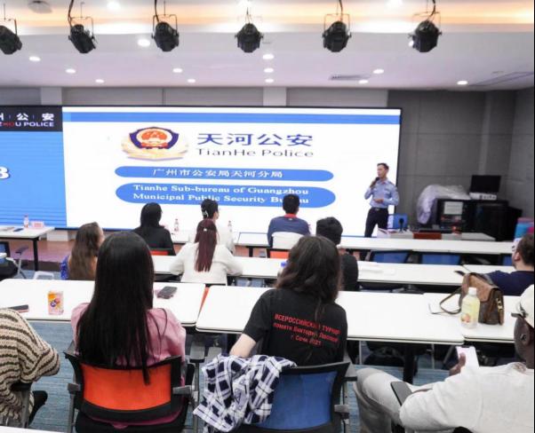 图:天河区公安分局出入境管理中队长麦家俊主讲留学生安全教育