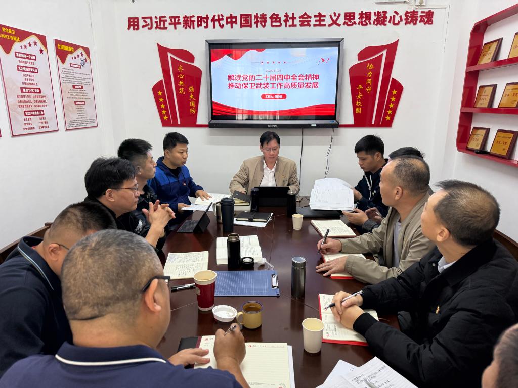 为深入理解、全面把握党的二十届四中全会精神,推动全会精神转化为守护校园安全、服务高质量发展的强大动力,11月24日,保卫部(武装部)组织全体党员及入党积极分子召开专题学习会。会议由支部书记陈静浪主持,以“解读党的二十届四中全会精神 推动保卫武装工作高质量发展”为主题,通过系统解读、实践部署与理论导学,凝聚思想共识,明确行动方向。