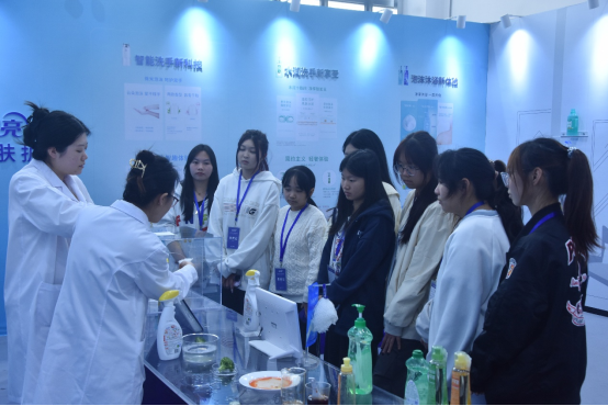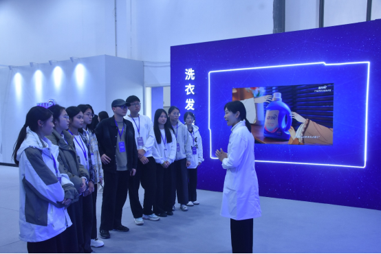 抵达现场后,蓝月亮工作人员热情接待了来访的师生。在讲解环节,工作人员化身专业讲师,详细介绍了蓝月亮各类产品的独特用法,从日常衣物清洁到特殊污渍处理,每款产品的精妙之处都被细致解读,同学们对洗涤产品背后的科学原理有了全新认识。大家专注聆听,不时就感兴趣的问题踊跃提问、积极交流。