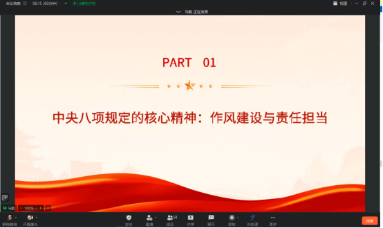 学院党总支书记马韵以“深入贯彻中央八项规定精神:作风引领师道 清廉铸就师魂”为题,剖析了中央八项规定精神对高校教师的关键引领作用。她表示,八项规定不仅是针对领导干部的纪律要求,更是全体教师应当内化于心的职业准则。