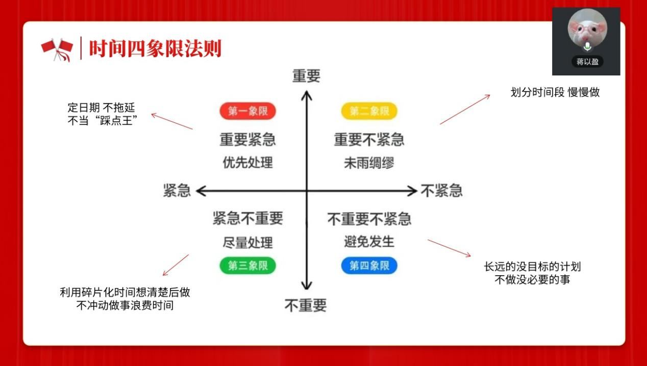面对学生干部常见的时间管理难题,蒋以盈分享了时间四象限法则。将事务划分为重要紧急、重要不紧急、紧急不重要、不重要不紧急四类,依据优先级合理安排处理顺序,避免拖延,高效利用时间。她还介绍了借助工具提升工作效率的方法,如利用金山文档实现信息实时共享与协同编辑,使用接龙管家便捷收集反馈和文件资料,通过微信置顶待办事项确保重要任务不遗漏。