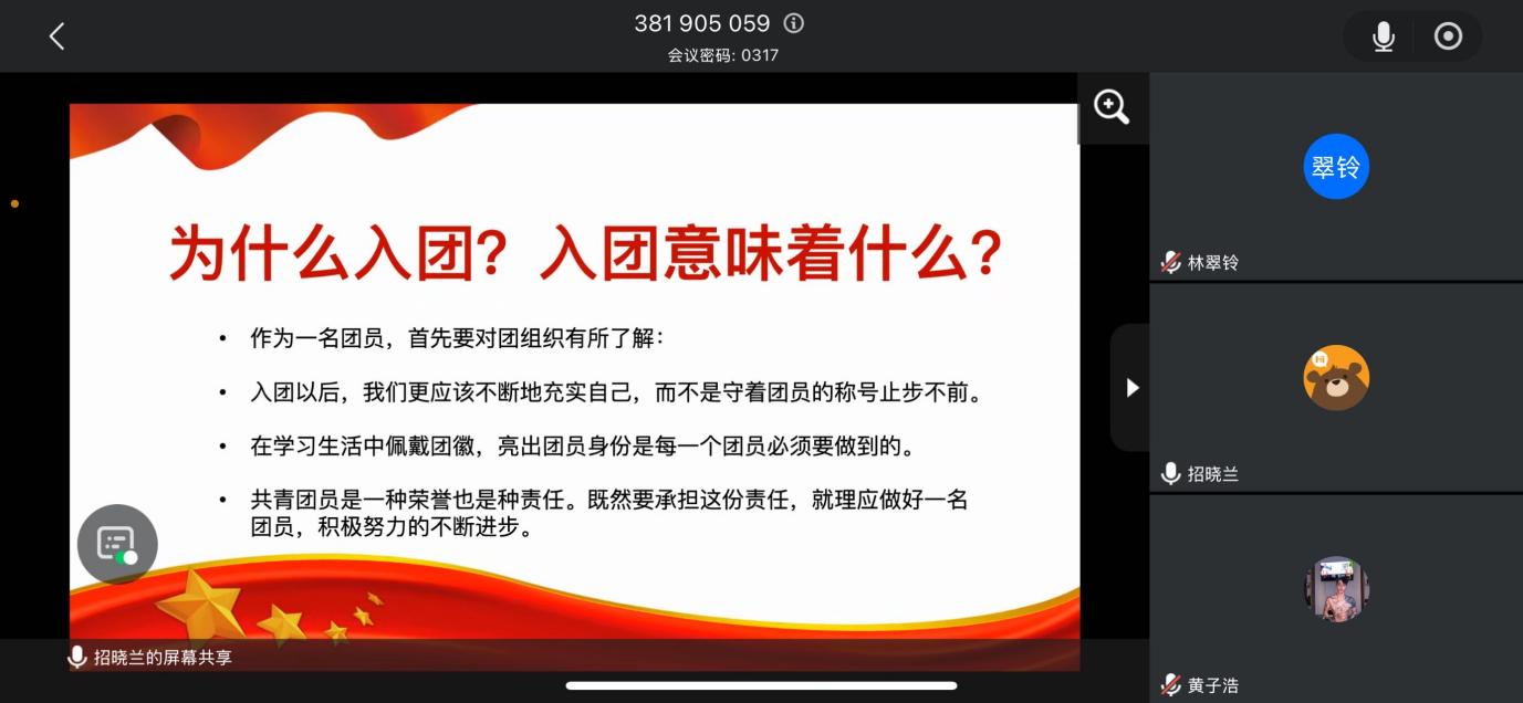 为了让学生坚定理想信念,牢记青春使命,财会金融学院团委3月18日,给入团积极分子开展了线上团课,由学院团委书记招晓兰老师主讲。