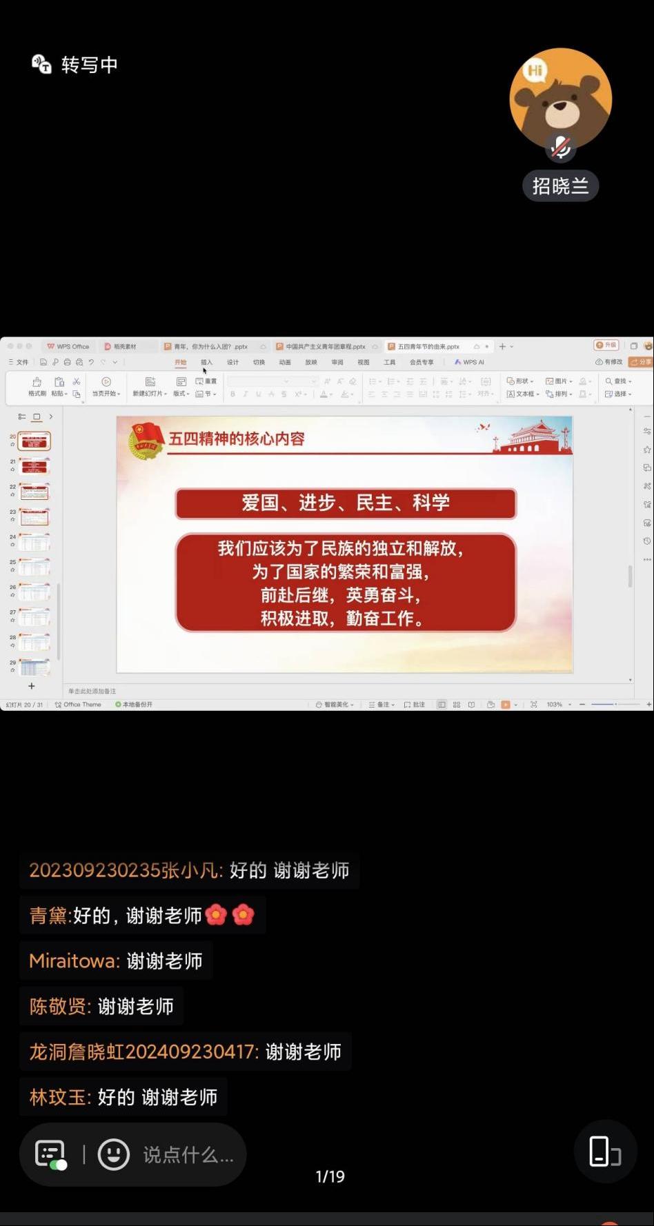 团课尾声,招晓兰老师着重解读了五四精神的核心内涵——爱国、进步、民主、科学,并结合“中国梦”的深刻内涵与奋斗目标,通过展示中国不同历史时期的GDP数据,直观呈现国家发展的历程与成就。她鼓励同学们将五四精神融入日常学习与生活,以实际行动为实现中华民族伟大复兴贡献力量。