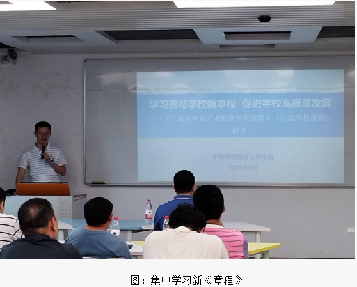 会上,副部长郑玄弘带领与会人员学习了学校新《章程》,他从新《章程》的修订背景、修订原则和依据、修订过程、修订内容等几个方面,对新《章程》的修订情况作了具体介绍和解读,帮助教职工深刻领会和准确把握新《章程》的核心要义和精神内涵。通过领学促学,增进了教职工对新《章程》内容的理解和把握,进一步激发教职工树立主人翁意识,更积极主动投身学校改革和发展,为学校高质量发展贡献智慧和力量。
