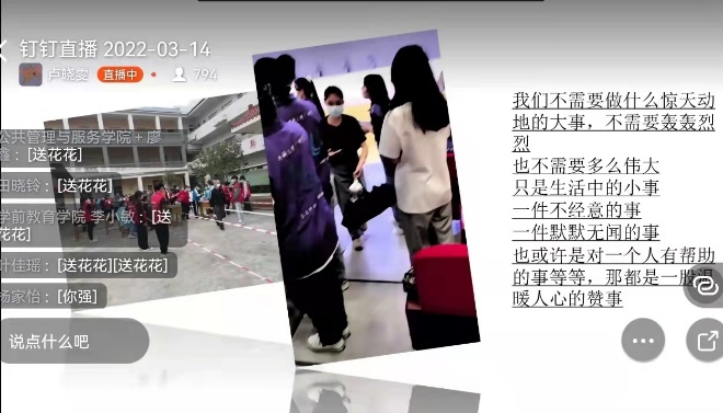 随后,学生宣讲代表发言。学前教育学院学生代表严丽琴为同学们讲解了什么是雷锋精神,结合自己100多次志愿服务时的经历,讲述了自己参与的志愿活动的经验,她鼓励同学们在课余时间积极投入到志愿服务活动。餐饮旅游学院学生代表李晓怡简介了雷锋的生平,并分享了自己的志愿服务经历,作为一名新时代的大学生志愿者,以自己是大学生志愿者而感到自豪,她希望同学们用实际行动践行使命担当。公共管理与服务学院学生范诗林结合协助毕业班师姐离校和义务献血活动的亲身经历,阐述了做志愿服务的成就和收获,也希望同学们能把青春贡献在有价值的地方。最后,主持人带领同学们进行雷锋知识互动环节,夯实学习基础。本次微课在奏唱中国共青团团歌——《光荣啊!中国共青团》中圆满结束。