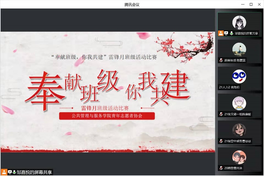 为深入学习贯彻习近平总书记关于雷锋精神的重要论述,培育和践行社会主义核心价值观,让学雷锋志愿服务活动走进校园,以实际行动践行雷锋精神、志愿精神,展现大学生的青春力量,3月28日晚,公共管理与服务学院在“腾讯会议”召开以“奉献班级,你我共建”为主题的雷锋月班级活动,我院党委副书记邹磊磊、学生会指导老师梁中玉、辅导员严丽清出席本次活动,我院青年志愿者协会全体干部干事及2020、2021级各班班级代表参加本次活动。