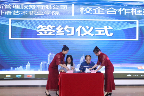 图:双方签订校企合作协议 随后,校企双方举行合作协议签约及授牌仪式。企业代表肖黎君与张晖共同签署校企合作协议书。张侃为肖黎君颁授公共管理与服务学院实践基地牌匾,肖黎君赠予我校索迪斯吉祥物。