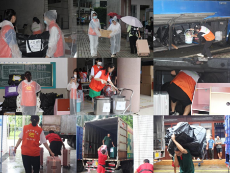图:旧物回收现场 凝心聚力有序行 全力以赴再出发 在搬迁工作期间,学生工作部、后勤部、保卫(武装)部和海珠校区相关负责人参与此次搬迁组织工作。在工作中始终坚持以保障和维护学生根本利益为出发点,深入一线倾听学生需求,了解同学们的困难,协助解决同学们问题,有效保障搬迁工作顺利进行。考虑到近日常有雨,学院提前为同学们配备了雨衣;后勤在两校区准备了凉茶和姜汤;两校组织大量志愿者帮助搬运行李。同学们纷纷表示感受到了学校的亲切关怀和暖心照顾。 搬迁工作正式开始,即使下着雨,但在党员同志及志愿者的帮助下,同学们井然有序地将已提前整理、打包、贴标签好的行李搬迁至指定位置,尽管汗流浃背,他们依旧坚守在自己的岗位上。中午11时,5辆客车及7辆货车携带全体同学及行李物品顺利到达海珠校区,搬迁公司工作人员将行李物品送至指定楼层。本次搬迁工作大家配合有序,总体连贯,一气呵成,共持续7个小时,于下午1时许顺利完成我院2021级257名同学的搬迁工作。搬迁完成后,学生工作部相关负责人、我院学工人员、搬迁班级德育导师即刻深入宿舍楼走访,下沉学生一线,充分了解同学们的情况,目前学生普遍反映良好。