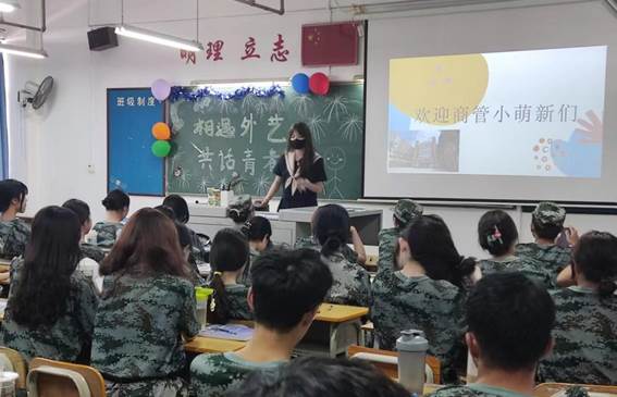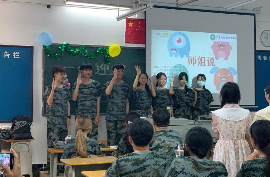 朋辈学习,培团队精神。为了让新生尽快熟悉和严格遵守学校的规章制度,了解大学学习、工作、生活的基本知识,形成班级向心力,项目团队按照学工部的相关要求,结合海珠校区的环境条件和公共管理与服务学院的特点,精心设计室内朋辈学习项目。培训团队在每一个班级墙上都挂了小气球,黑板报中设计了“我上大学啦”“初进外,别见外”等欢迎字眼,周围写满了本班级新生的名字,俏皮又可爱,让新生一见心喜,再见倾心,自然而然地形成班级的集体意识。破冰游戏之后,除完成新生自传撰写,校区生活常识、学生手册学习志愿服务答疑、入党启蒙教育……丰富的内容在学长们结合亲身经历的讲解下,同学们感到格外接地气和亲切,一点也不觉得枯燥单调。穿插在培训过程中的朋辈才艺交流更在瞬间拉近了新生之间、学长和学弟学妹之间的距离,亲切感油然而生。秋日明媚的阳光射进窗户,为每个新生专心致志的样子平添了几分岁月静好的美丽。