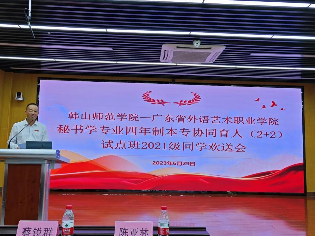图:韩山师范学院副校长陈亚林致辞 韩山师范学院校党委常委、副校长陈亚林在致辞中对圆满完成在韩师两年学业的49名同学表示热烈祝贺。他充分肯定了两校本专协同的育人模式。他希望同学们到了新校园,继续朝着自己的理想和目标勇敢前进,奋力拼搏。