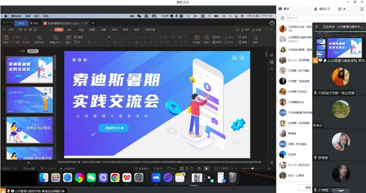 为深入贯彻《关于深化现代职业教育体系建设改革的意见》,加快构建校企协同的职业教育高质量新机制,提升学生实践能力,拓宽学生暑期实践渠道,推进公共管理与服务学院与索迪斯打造现代服务行业产教融合共同体,探索产教融合新路子,共同打造了校企合作项目——索迪斯暑期实践活动。帮助同学们更快适应自己的岗位和了解工作职责,公共管理与服务学院与索迪斯企业分别于7月4号、7月5日开展暑期实践活动培训交流会,通过线上+线下结合的方式为同学们答疑解惑。 一、公共管理与服务学院索迪斯暑期实践培训交流会 7月4日晚,公共管理与服务学院以线上会议的形式举行索迪斯暑期实践活动培训交流会,公共管理与服务学院党委书记张举正、副院长邹冰、实践教研室黄旭欣和罗维维老师,及暑期实践活动12名同学们参加了会议。
