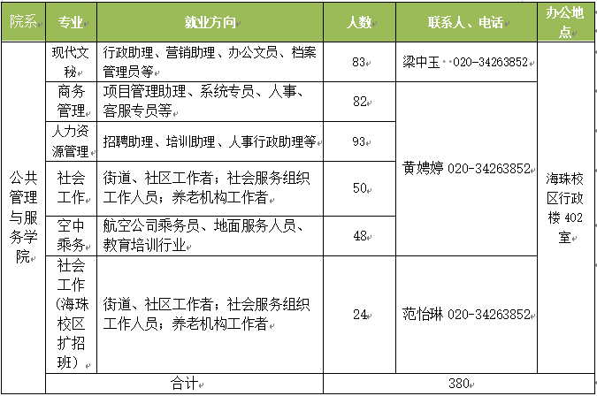 公共管理与服务学院(原中文系)成立于2004年,是教育部职业院校文秘类专业教学指导委员会广东省联络处主任单位、中国高等教育学会秘书学专业委员会常务理事单位、广东高等教育学会秘书学专业委员会会长单位。学院位于广州市新港中路艺苑南路,地处广州市新城市中轴线上,西邻中山大学,东靠广州国际会展中心,与广州电视塔咫尺相望,交通便捷,设施完善,校园环境优美,文化气息浓厚,是广大学子学习知识,掌握技能、走向社会,实现辉煌人生的摇篮。 专业优势明显。现开设了现代文秘、人力资源管理、商务管理、社会工作、空中乘务、婚庆服务与管理和智慧健康养老服务与管理等7个专业,在校生1991人。现代文秘专业群获得广东省高职院校高水平专业群建设立项,现代文秘专业为省高职教育重点专业,人力资源管理专业为校特色建设专业。 师资力量雄厚。学院现有教职工46人,专任教师31人;高级职称11人,其中教授2人;硕士以上学位32人,其中博士3人。另有28位行业专家、23位一线技能人才构成的校外兼职教师队伍。教师队伍中有全国社会工作专业领军人才,广东省中小学幼儿园教师校园长研训专家库专家委员、南粤优秀教育工作者、南粤优秀教师、广东省师德先进个人、广东省首批学前教育与特殊教育培训专业指导委员会专家委员。人力资源管理专业教学团队为校级“优秀教学团队”。学院教学团队爱岗敬业、治学严谨、教学与实践经验丰富、科研能力强、学历年龄结构合理、专兼结合,为学生的职业技能训练提供了保障。 办学条件优越。学院拥有省级经费支持建设的高技能型通用管理能力培养公共实训中心,包括行政管理实训室、秘书综合技能实训室、人力资源管理实训室、电商直播间、市场营销实训室、航空实训室、婚庆实训室、社工实训室等二十多间实训室。另建有“易为秘书事务所”“问道人力资源服务中心”“睿领人力资源服务中心”“中小学师资培训服务中心”等校内真实项目实训基地。学院已建成教育部教指委精品课程2门,省级精品资源共享课2门,校级课程30门,校企共同编写《办公室事务处理》《秘书沟通与谈判》《秘书沟通与礼仪》《文秘写作基本理论与技巧》《人力资源管理》《大学语文》《普通话水平测试攻略》《老年人活动策划与实施》《社会工作师应试解难》《助理社会工作师应试解难》等工学结合教材。 社会服务能力不断增强。已为多个基层企事业单位提供有关社交礼仪、交际口语、营销技巧、公文写作、档案管理、人力资源管理技术等方面培训与服务。承担过千人级的大型商务会议和全国性、全省性的学术会议与大赛的会务工作。2015年4月建成“广东文秘”微信平台,现已推送文秘专业相关信息1600多篇,在省内外文秘专业中均有较大影响力。人力资源管理专业承担过企业的大型校园招聘工作。商务管理专业举办过我校首届网络直播营销大赛。 人才培养成果丰硕。近三年毕业生总体就业率均达100%。学生在全国、全省职业技能大赛和学生素质竞赛中屡获佳绩。现代文秘专业学生近三年连续获得全国商务秘书职业技能大赛团体一等奖,2022年广东省“中文信息处理”大赛一等奖;人力资源管理专业近三年在“踏瑞杯”高职高专人力资源管理技能大赛中获全国总决赛特等奖1次,一等奖2次,2022年获广东省职业院校学生职业技能大赛人力资源管理技能竞赛二等奖,2021年获广东省职业院校学生专业技能大赛人力资源管理技能竞赛三等奖。2018年文秘与人力资源管理专业混合组队参加“‘挑战杯·创青春’广东省大学生创业大赛”获得银奖。