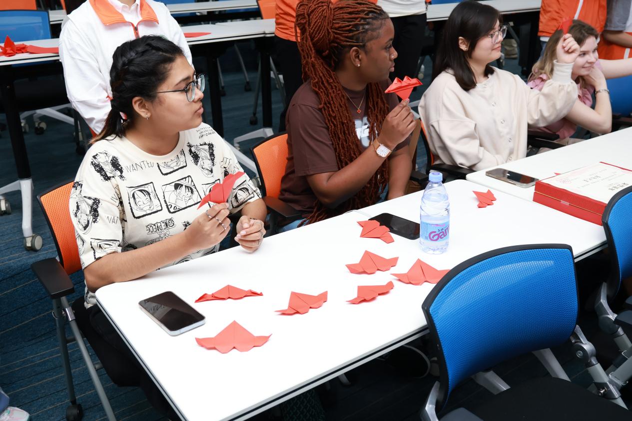 文化体验环节,在李岚瑾老师的指导下,留学生们参与了折纸活动,将红色纸张折叠成展翅欲飞的红心,寓意“赤子之心”。这些红心被粘贴在世界地图边缘,象征着“红心展翅越重洋,赤子情怀扬五洲”。