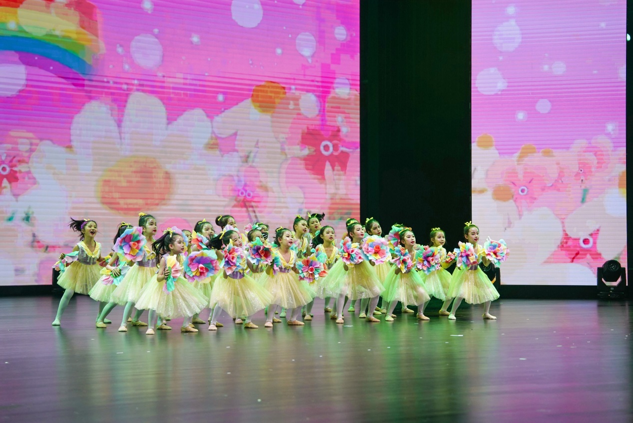 舞蹈《花儿向阳开》通过灵动轻盈的舞蹈动作,展现孩子们如同朝阳下的花朵,朝气蓬勃、积极向上,寓意在艺术的阳光照耀下健康成长,体验生命之美。