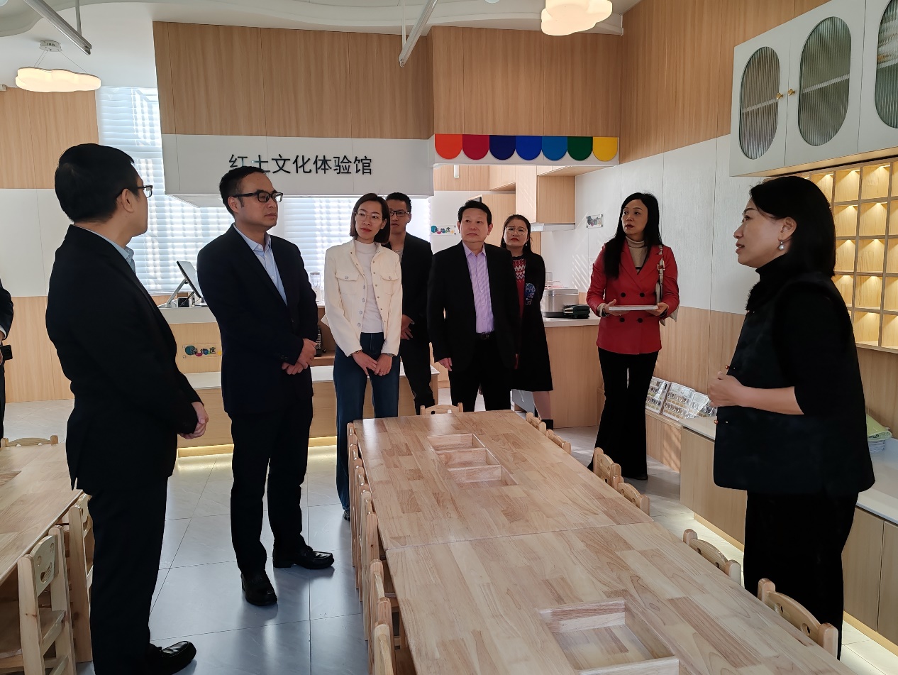 随后,调研组走访调研了廉江市第一幼儿园。在幼儿园领导的陪同下,马栩生一行实地参观了学校援建的红土文化体验馆,听取了园方关于体验馆建设过程及其今后在丰富幼儿动手操作能力、食育实践教学、本土文化教育等方面的多功能使用规划介绍。双方就2024年园校合作开展的原创绘本开发、美润华言润乡土、教师培训等系列项目情况及2025年进一步示范引领廉江市学前教育高质量发展等共建计划进行了深入交流。