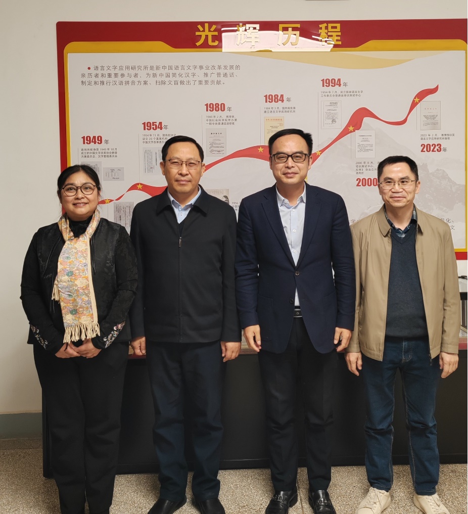 随后,调研组前往教育部语言文字应用研究所调研交流,教育部语言文字应用研究所所长、国家普通话测试中心主任刘朋建对我校到访表示诚挚欢迎。刘朋建对我校普通话培训、测试、科技创新以及国家语言文字推广工作取得的成绩予以高度评价。他详细介绍了我国语言文字工作的发展历程和语言文字应用研究所为国家通用语言文字推广普及、语言文字事业改革发展作出的突出贡献。