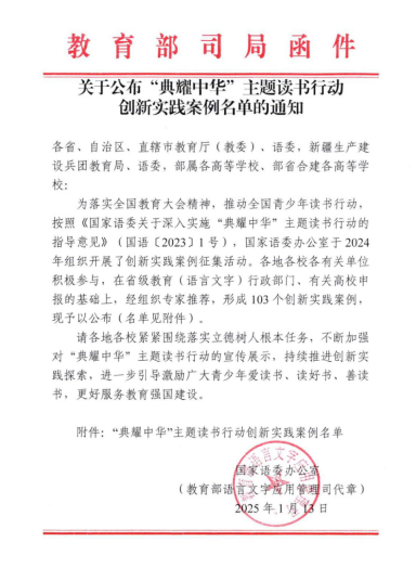 近日,国家语委办公室(教育部语言文字应用管理司)公布2024年“典耀中华”主题读书行动创新实践案例名单,全国共103个案例入选,我校《“悦”读情暖童心,经典“语”你同行——“3535”“悦”读模式》凭借独特的推广模式和丰富的创新实践活动,成功通过省教育厅、教育部的专家评审,入选全国“典耀中华”主题读书行动创新实践案例。