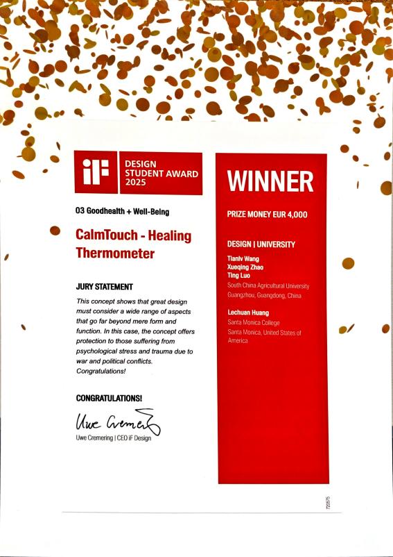 王天铝此次获奖作品为《CalmTouch-Healing Thermometer》,CalmTouch-疗愈温度计针对传统体温枪易引发难民恐惧和心理创伤的痛点,创新性地将测温方式转变为安抚性的抚触动作,在保障测温精准的同时,缓解用户情绪压力,带来安全与关爱的双重体验。