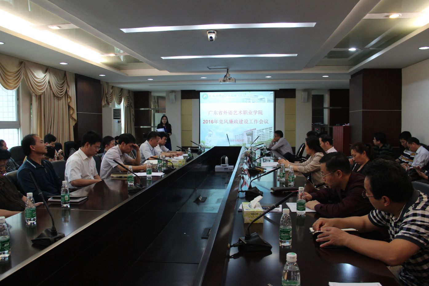 4月20日下午,我校在五山校区行政楼203会议室召开了2016年党风廉政建设工作会议,学习贯彻2016年广东省高校党风廉政建设工作会议的精神,部署2016年学校党风廉政建设工作,落实全面从严治党要求,进一步推进我校党风廉政建设和反腐败工作。会议由学校党委书记卢羡文主持,学校党委副书记、纪委书记陈楚瑞代表党委作了工作报告,曾用强校长、熊晓云副校长、郑永江副校长、林红副校长及学校全体中层领导干部参加了会议。