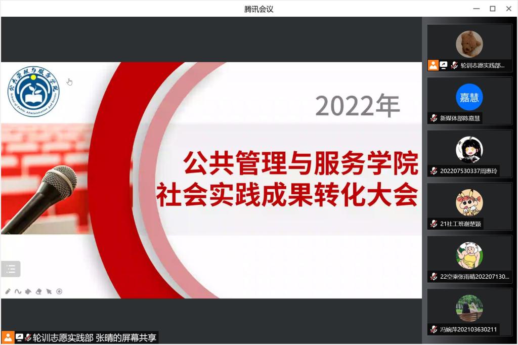 为深入学习习近平总书记在庆祝中国共产主义青年团成立100周年大会上的重要讲话精神,坚定信念听党话、跟党走,10月18日,公共管理与服务学院通过线上会议举行2022年社会实践成果转化分享会,我院党委副书记邹磊磊、团委书记黄娉婷、各实践团队成员以及各班代表参加会议。