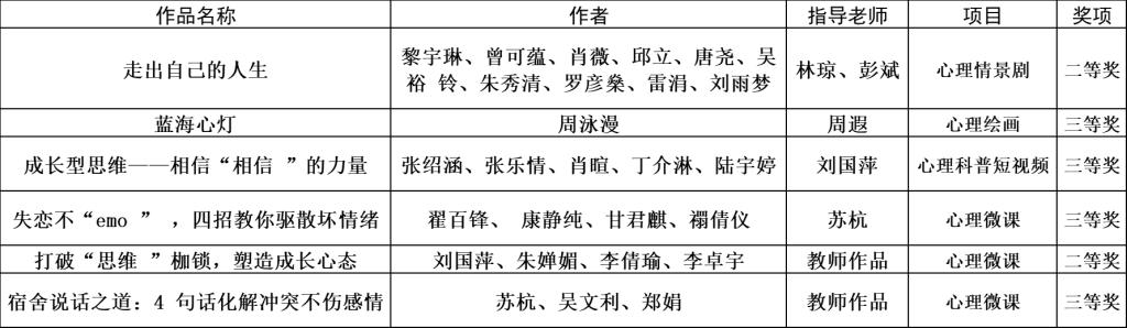 在激烈的省级评审中,我校参赛作品凭借鲜明的主题立意与多元的表现形式斩获佳绩,其中,《成长型思维——相信“相信”的力量》和《打破“思维”枷锁,塑造成长心态》两个作品聚焦积极心理品质培育,以深入浅出的内容阐释成长型思维的实践价值;《蓝海心灯》和《走出自己的人生》则以温暖细腻的表达传递生命力量;针对校园人际关系与情感调适的《宿舍说话之道:4句话化解冲突不伤感情》和《失恋不“emo”,四招教你驱散坏情绪》则以高度实用、易于操作的沟通策略与情绪调节技巧,回应学生在人际关系与情感调适中的真实需求,充分彰显了心理育人工作的温度、深度与实效。